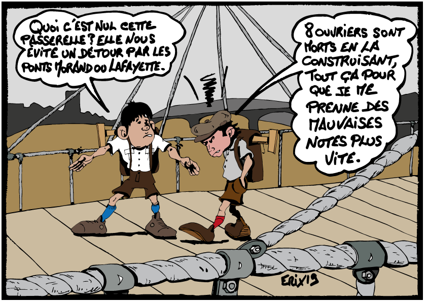 La passerelle est en fil de fer et repose sur trois piliers... Pendant sa construction, un boulon cassa, un câble lâcha et la passerelle s'écroula. Huit ouvriers se noyèrent.